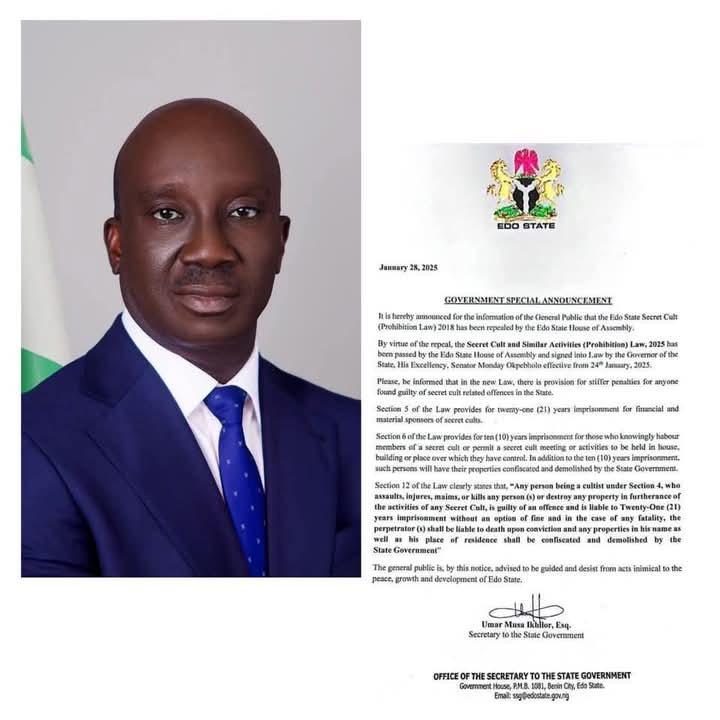 Governor Monday Okpebholo has taken a firm and uncompromising stance against the menace of cultism with the passage and signing into law of the Secret Cult and Similar Activities (Prohibition) Law, 2025. This bold step, championed by His Excellency, Monday Okpebholo, demonstrates the Government’s commitment to restoring peace, security, and order in Edo State.