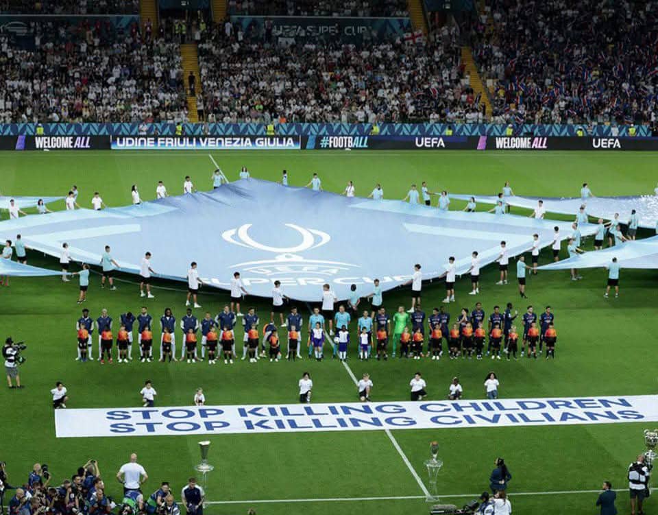UEFA delivered a powerful message ahead of the UEFA Super Cup match between Paris Saint-Germain and Tottenham Hotspur, rolling out a giant banner that read, “Stop Killing Children. Stop Killing Civilians”. The banner was carried by children from war-affected areas, including two from Gaza, at the Stadio Friuli in Udine, Italy.