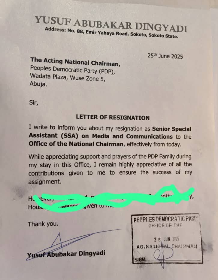 In a letter dated June 25, 2025, and addressed to the Acting National Chairman, Ambassador Iliya Damagum, Dingyadi expressed gratitude for the opportunity to serve the party.