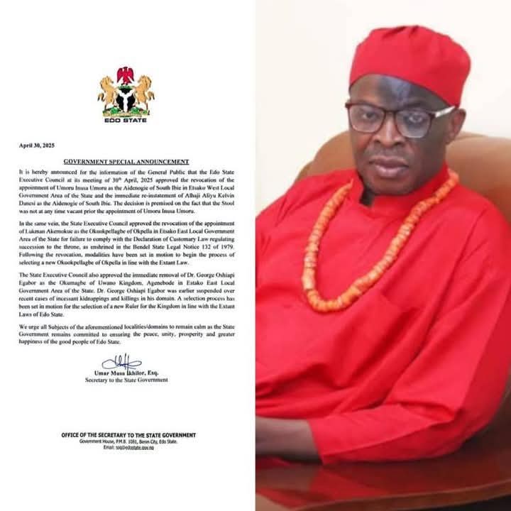 Furthermore, Dr. George Oshiapi Egabor has been removed as the Okumagbe of Uwano Kingdom, Agencbode, in Etsako East Local Government Area, following his suspension over alleged failure to address recent cases of kidnappings and killings in his domain. A selection process has been initiated to find a new ruler for the kingdom in line with Edo State laws.