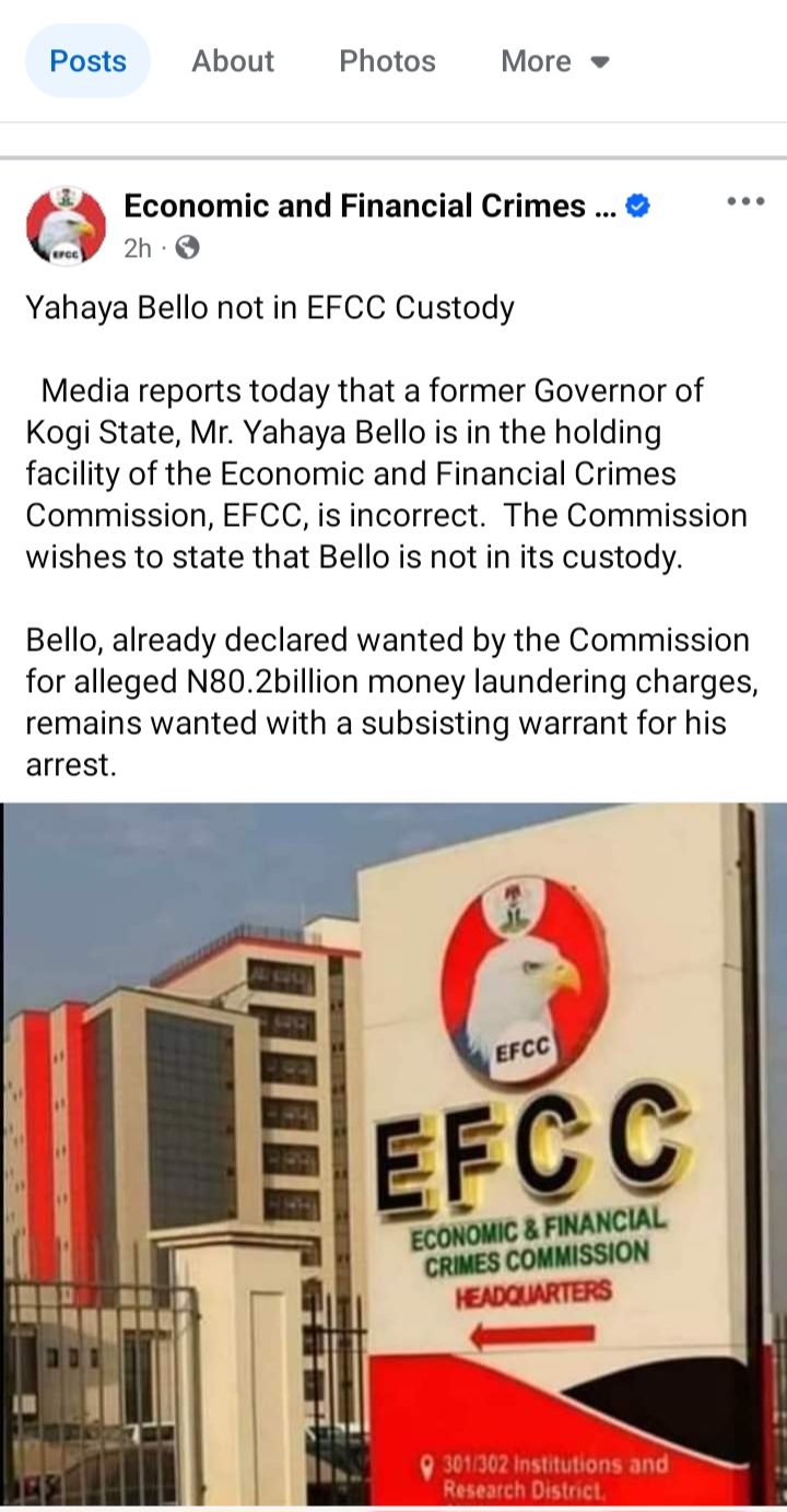 The Economic and Financial Crimes Commission (EFCC) has come out to deny reports that former Kogi State Governor Yahaya Bello is in their custody.