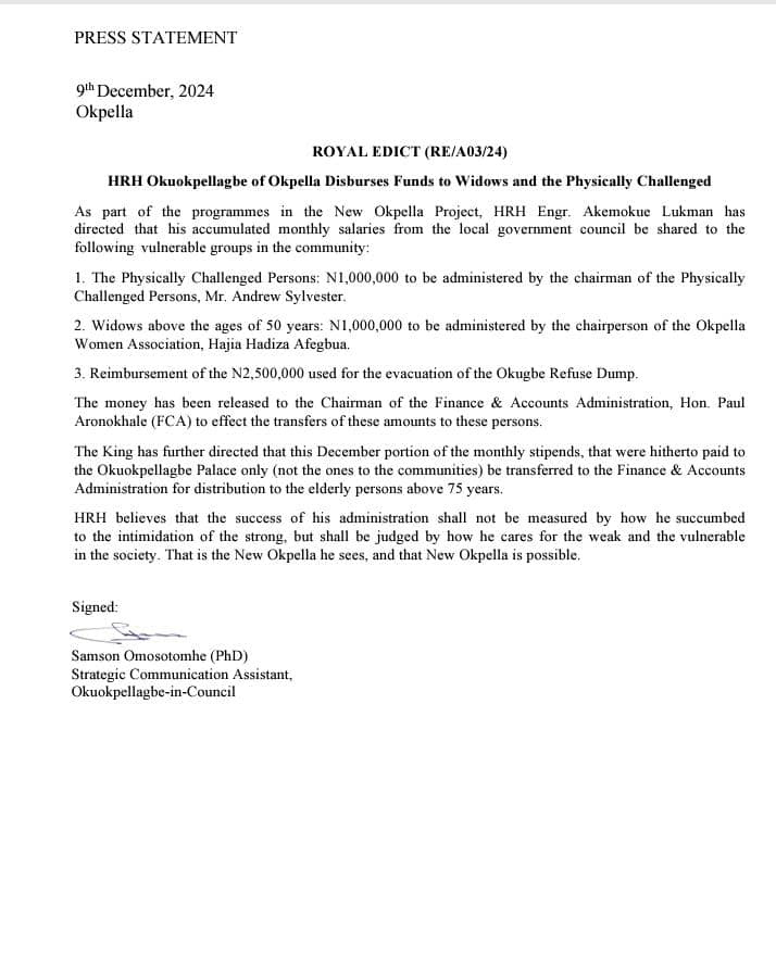 According to a press statement signed by Strategic Communication Assistant, Okuokpellagbe-in-Council, Samson Omosotomhe (PhD), the king has allocated N1,000,000 to the Physically Challenged Persons, to be administered by Mr. Andrew Sylvester, chairman of the Physically Challenged Persons. Another N1,000,000 has been set aside for widows above 50 years, which will be administered by Hajia Hadiza Afegbua, chairperson of the Okpella Women Association.