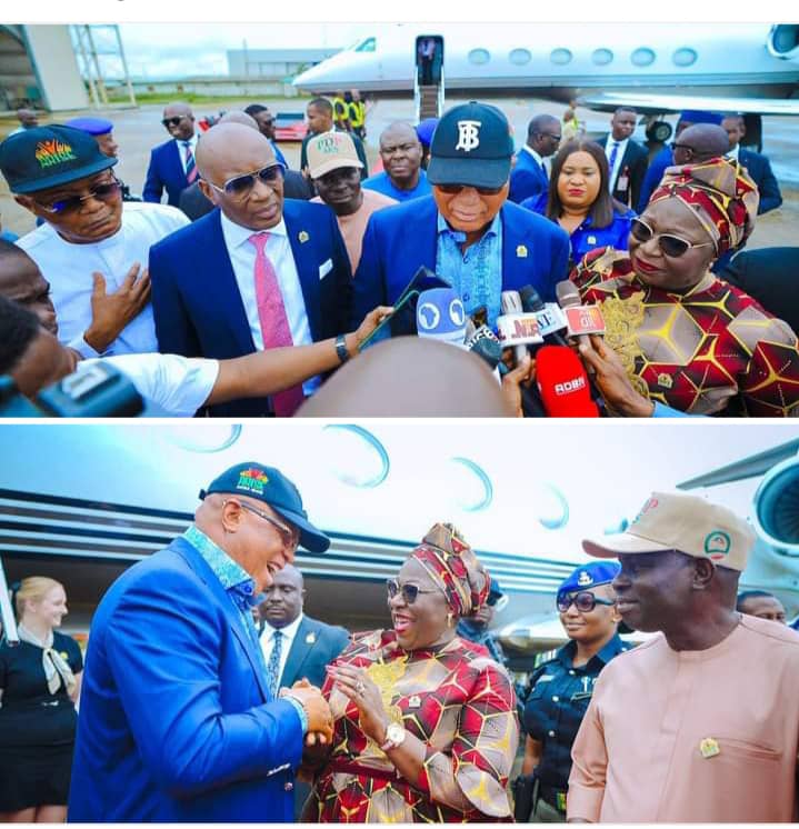 The Governor was received at the airport by top government functionaries led by the state Deputy Governor, Senator Akon Eyenehi.