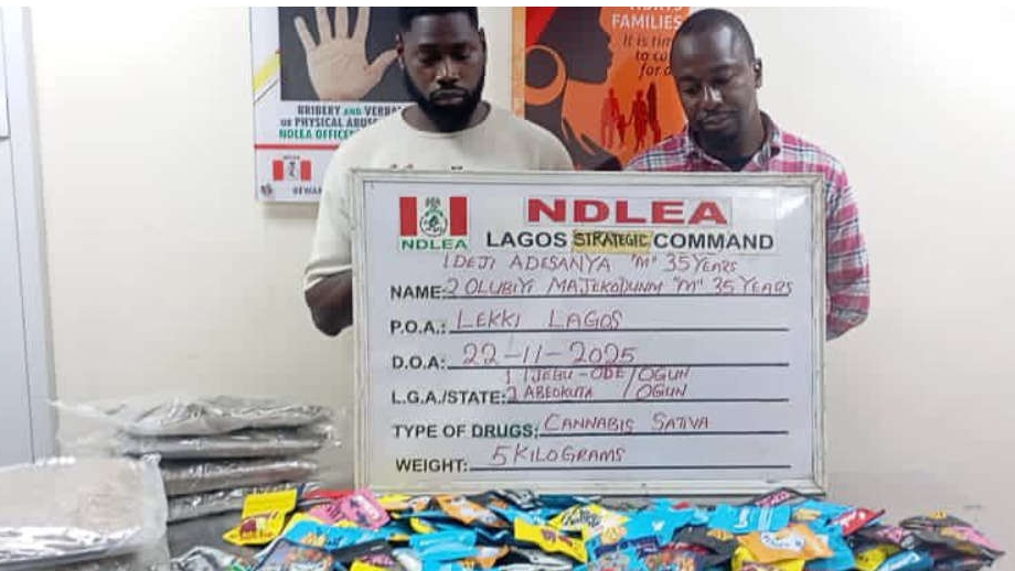 “Following credible intelligence about the activities of the syndicate which operates and distributes through a WhatsApp platform, NDLEA operatives on Saturday, 22nd November 2025, raided their apartment at Ojulari street, Ikate area of Lekki, where a large quantity of the designer sachets and 5kilograms of Loud were recovered from them at the point of their arrest.”