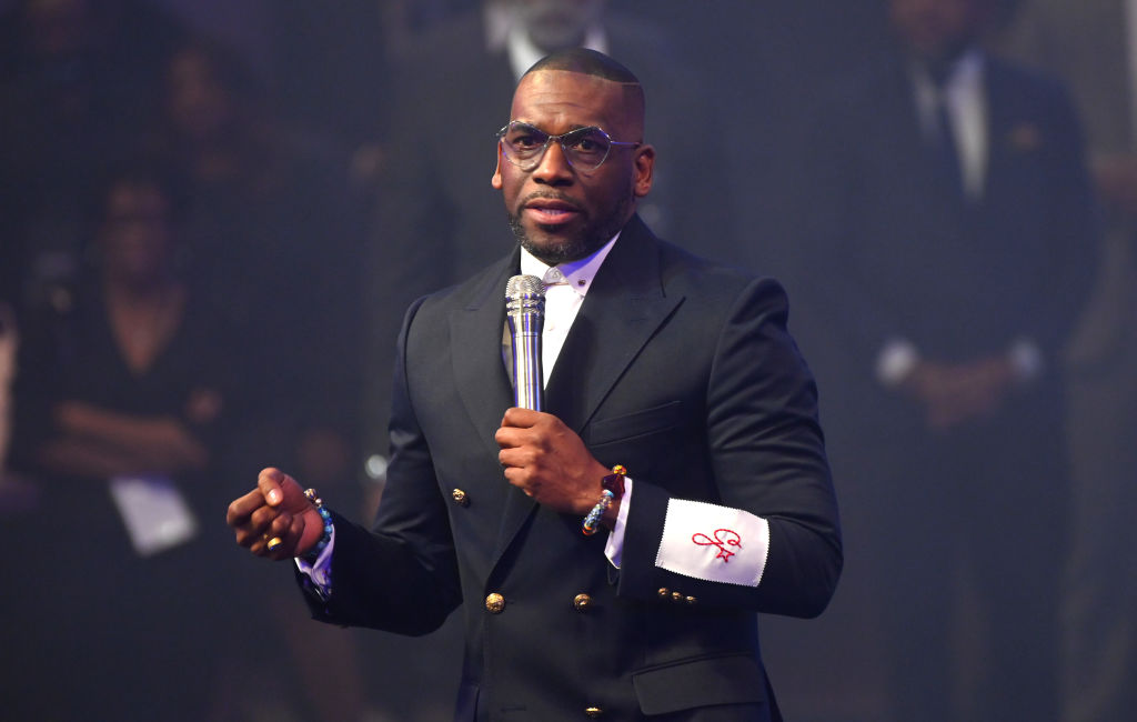 STONECREST, GEORGIA - APRIL 15: Pastor Jamal Bryant speaks onstage during New Birth Missionary Baptist Church ‘The Return’ Good Friday Service at New Birth Missionary Baptist Church on April 15, 2022 in Stonecrest, Georgia. The Easter weekend event kicked off on April 15, welcoming back church goers with an in-person church worship after a 2 year hiatus because of the ongoing global COVID-19 pandemic. (Photo by Paras Griffin/Getty Images)
